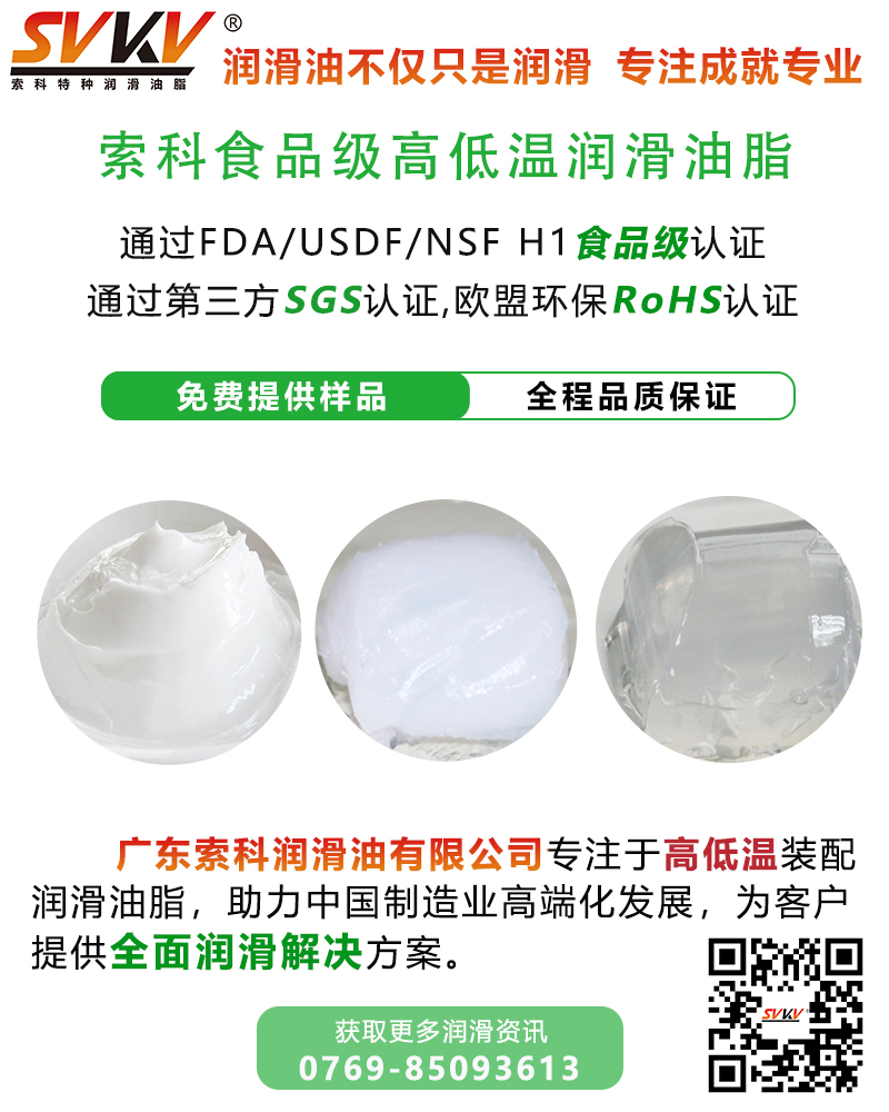 SVKV索科食品級全合成高低溫消音潤滑油脂選用食品級的基礎油和無毒無害的添加劑精制而成,專為食品加工和醫(yī)療設備而研制。SVKV索科食品級全合成高低溫靜音潤滑脂符合美國FDA和USDA法規(guī)和標準,并通過美國USDA/NSF H-1食品級認證,保障烤箱食品安全健康。