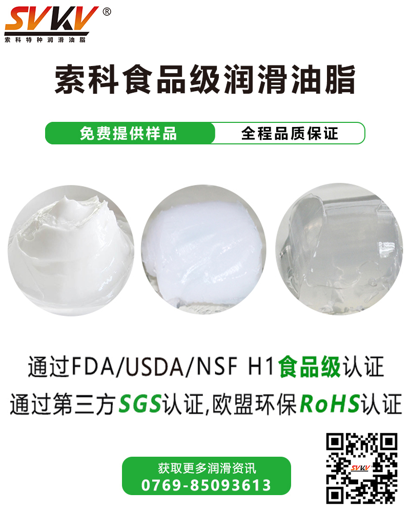 索科SVKV系列食品級潤滑油脂還通過美國FDA、USDA/NSF—H1食品級安全認(rèn)證,無毒無害,安全衛(wèi)生有保障。