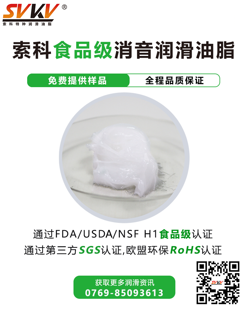 索科SVKV食品級消音潤滑油脂,選用食品級基礎(chǔ)油和無毒無害的添加劑精制而成,專為食品醫(yī)療設(shè)備所研制。索科SVKV食品級消音潤滑油脂符合美國FDA和USDA法規(guī)標(biāo)準(zhǔn),并通過USDA/NSF-1食品級認(rèn)證,保障設(shè)備產(chǎn)品的衛(wèi)生安全。