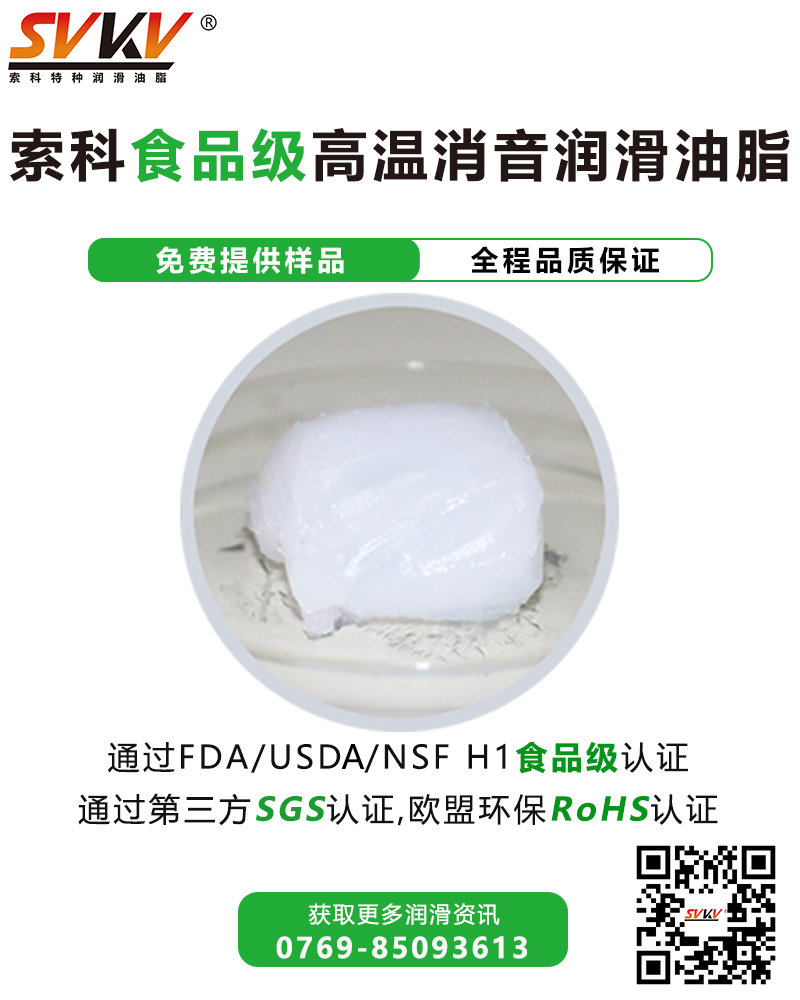 索科SVKV食品級高溫消音潤滑油脂選用食品級的基礎(chǔ)油和無毒無害的添加劑精制而成,專為食品加工和醫(yī)療設(shè)備而研制。索科SVKV食品級高溫消音潤滑油脂符合美國FDA和USDA法規(guī)和標準,并通過美國NSF H-1食品級認證,保障烤箱食品安全健康。