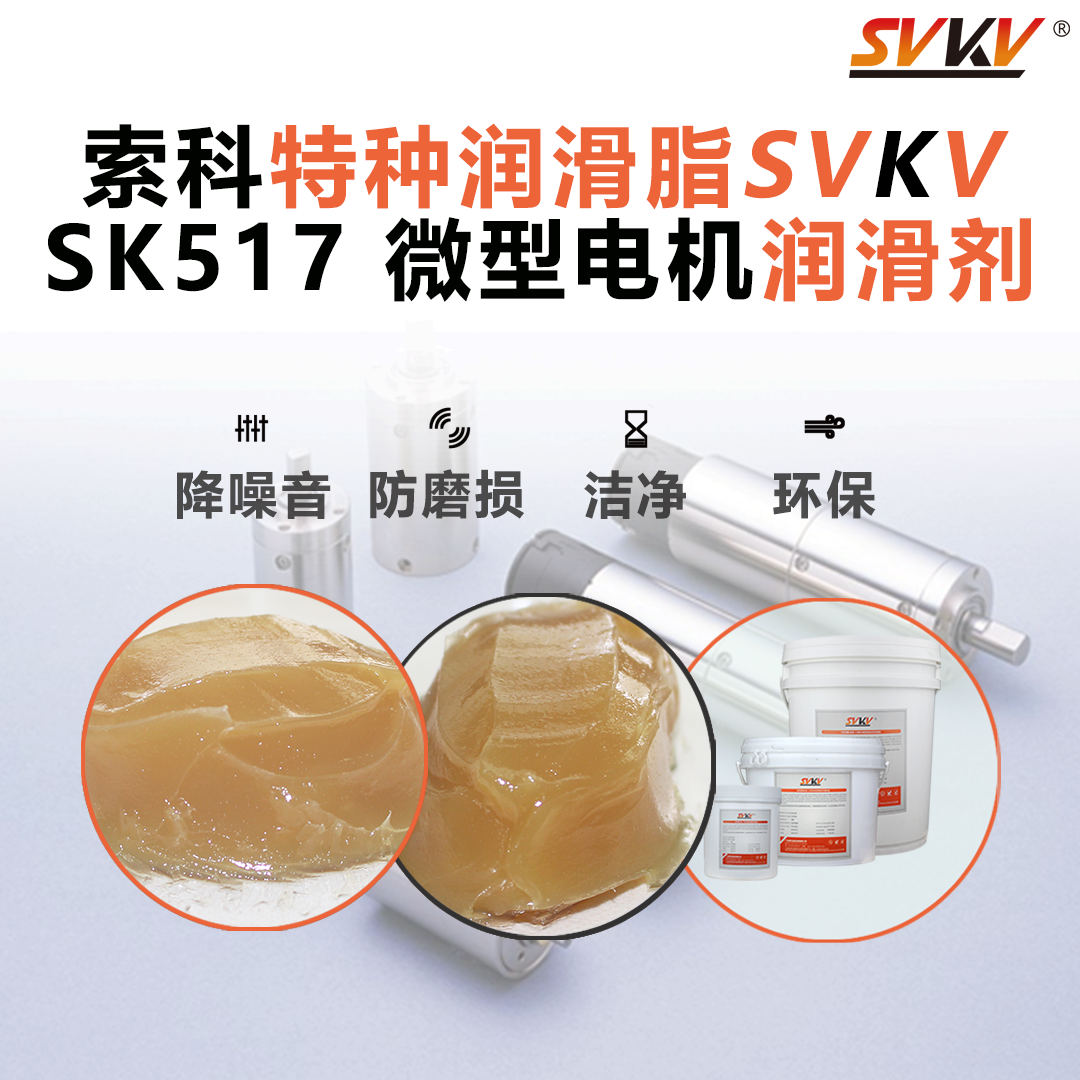 推薦索科SVKV SK517系列微型電機潤滑脂。減少電機中齒輪磨損,降低噪音,達(dá)到長壽命和防水的效果。適用中低轉(zhuǎn)速的齒輪、軸承,塑膠/塑膠、金屬/塑膠的潤滑、消音、降電流等效果。